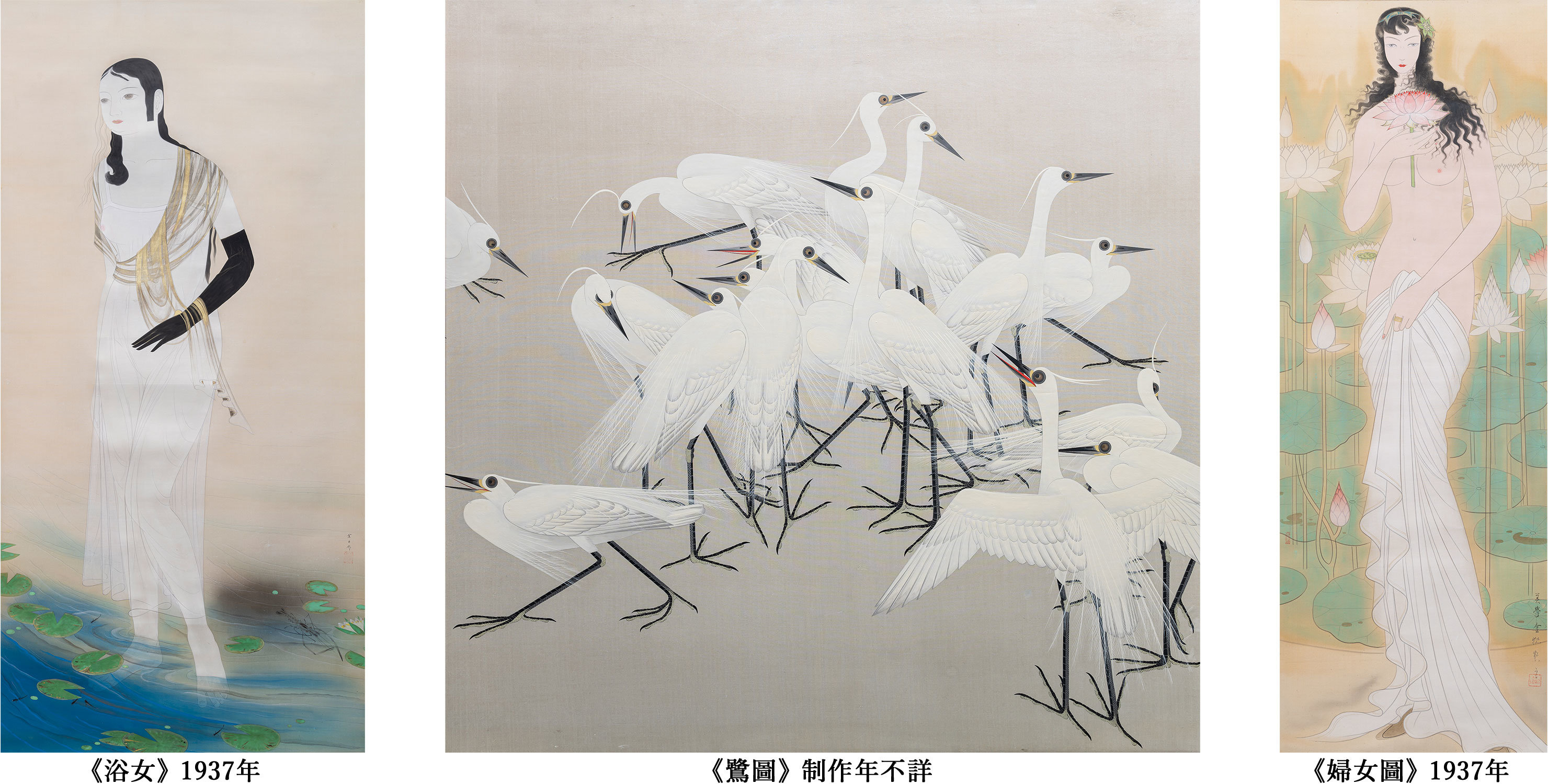 金猊独自の絵画世界を考察する。1933年の卒業制作《菊花讃頌》(所在不明・モノクロ写真)にはじまり《観音圖*》(1936年頃)《薫風》(1937年・焼失)《壁畫に集ふ》(1938年)などの大型屏風作品群に、金猊はもっとも精力を注いで制作し、自信を持って発表したに違いない。